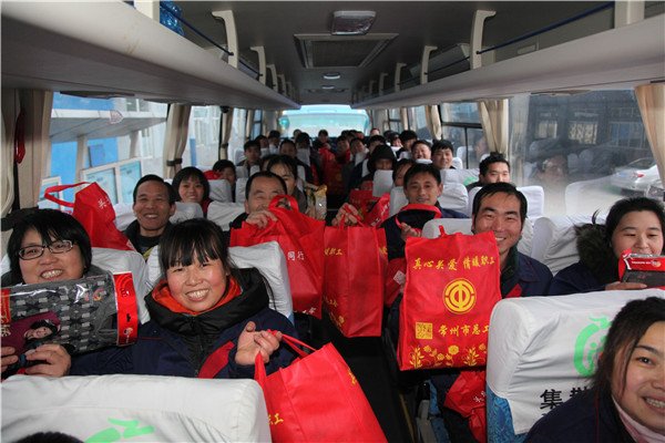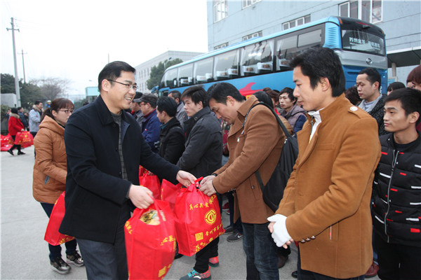 1月25日上午,美彩国际副主席张小军带领市总工作人员慰问平安返乡农民工和坚守岗位职工。给即将踏上回家路的农民工和坚守岗位的职工送上春节慰问品和新春祝福。 早晨7点,晨曦微露,常州格力博有限公司早已灯火通明,人声鼎沸。农民工朋友们穿戴整齐,笑容写在脸上。他们迫不及待地将行李一包接着一包放进大巴车上。由于该公司处于生产旺季,为了既能满足生产用工需求,又能让农民工回家过年,该公司对因为生产原因25日以后返乡的员工,提供集中包车、拼车或帮助购票的优惠政策,集中包车发往河南、安徽,共计240人;其他160人由公司统一帮助购票,确保员工平安返乡,与家人团聚。 临发车前,市总工会和钟楼区总工会共同给大家带来年货大礼包,并致以新春问候。工会领导叮嘱他们:在新春佳节期间,多留点时间陪陪双亲和孩子,以一种健康的生活方式传递正能量。过完春节,希望你们准时平安回到工作岗位,第二故乡常州期待着你们早日回来,在常州这片热土,与工友们一起共同打拼,共创美好未来! 据悉,市总工会次日还将到侨裕集团控股集团慰问平安返乡农民工。该集团为前往安徽的105名农民工集中包车,确保农民工平安返乡过年。