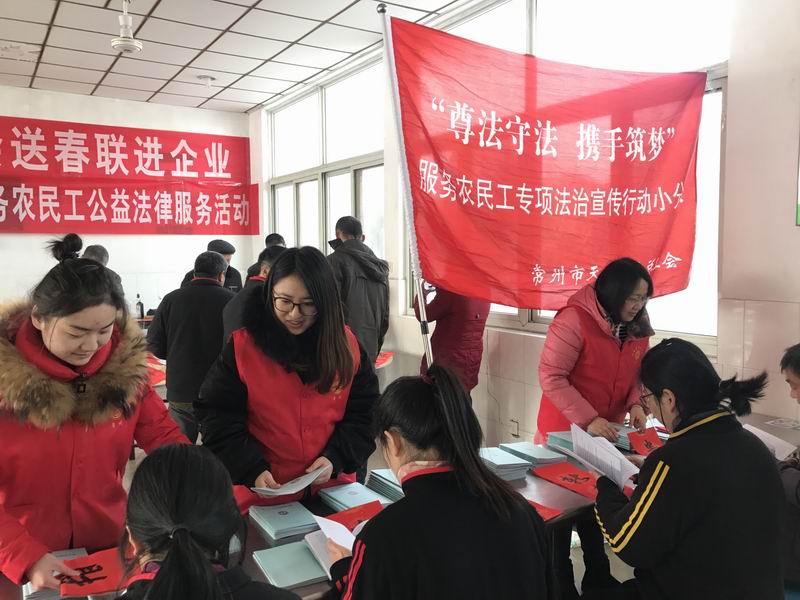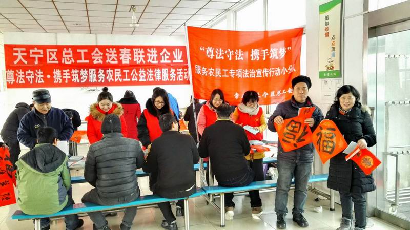 (本网讯)1月29日,天宁区总工会联合开展了“尊法守法·携手筑梦”服务农民工法律公益服务暨“送春联进企业”活动。