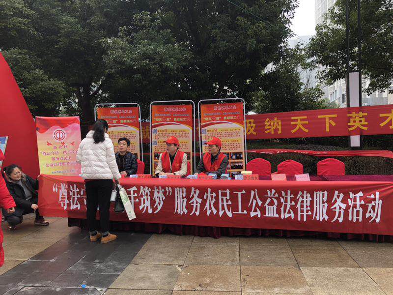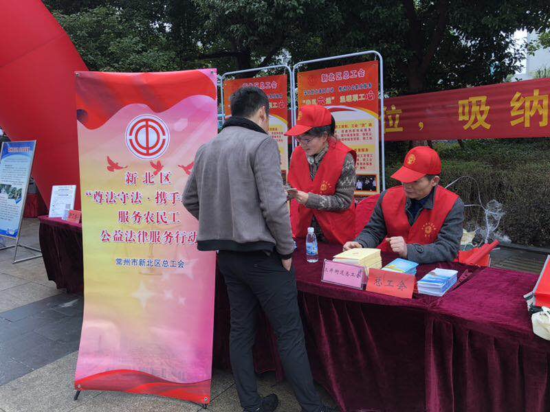 (本网讯) 3月3日,2018“春风送岗”大型巡回招聘会在新北区万达广场举行。新北区“尊法守法·携手筑梦”服务农民工公益法律服务行动小分队深入现场进行法治宣传服务。