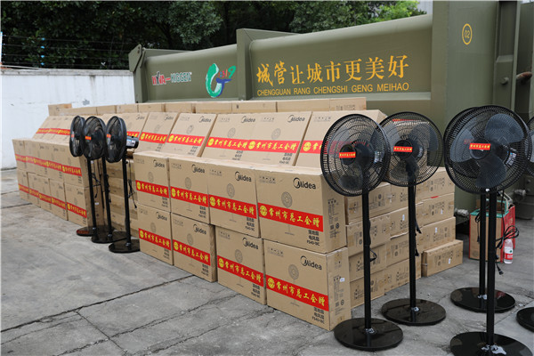 300台电扇,源于市政协总工会界别组近日一次调研。政协委员们围绕改善提升环卫工工作环境和安全保障水平,推动城市管理工作高质量发展积极建言的同时,与环卫工座谈交流时了解到,环卫工人休息室内配置了一批生活设施,但是大家觉得还需要一台电风扇。全国劳模、天宁区环卫工人黄峰说,尽管有的休息点内有空调,但干得满头大汗的环卫工如果直接进空调房容易着凉。吹吹电风扇,逐步降温,更利健康。