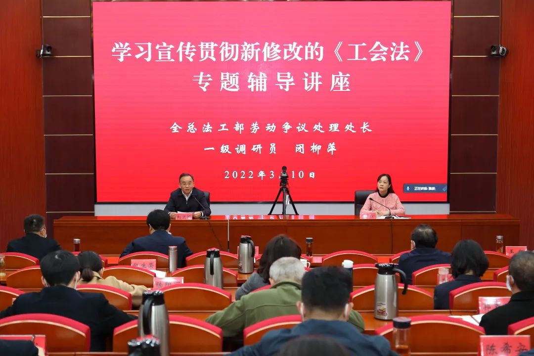 3月10日上午,市总工会召开党组理论学习中心组(扩大)专题学习会议,学习宣传贯彻新修改的《工会法》。全国总工会一级调研员、法工部劳动争议处理处闭柳萍处长应邀作专题视频辅导,市总工会党组书记、副主席刘卫国出席并讲话,市总工会副主席王红主持讲座。