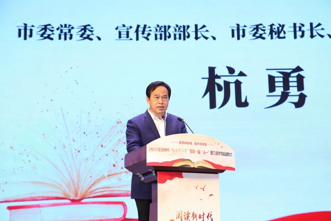 杭勇在致辞中表示,常州是千载读书地、世代书香城。近年来,常州不断提升“书香常州幸福阅读”内涵,全力打造全国有影响、全省有地位的“秋白读书节”品牌,持续营造“人人好读书,好书人人读”的浓厚氛围,让城市每个角落飘满书香气息。常州已连续23年居民人均购书支出位居全省第一,全民阅读指数连续多年居全省前列,荣获江苏省第二批书香城市建设示范市。围绕提升常州全市职工科学文化素质、促进职工岗位成才,常州建立53家全国职工书屋示范点,近700家省、市级职工书屋,7000余个基层便利阅读站点,基本构建起多元立体的职工阅读空间。 杭勇表示,常州将以此次读书节为契机,以提升全民阅读指数、满足人民群众对高质量阅读的需求为目标,加快健全完善全市城乡公共阅读服务体系,让阅读成为每个人的日常习惯,让每一天都成为读书日,通过读书启发智慧、更新知识、陶冶情操,为奋力推进“532”发展战略,谱写“强富美高”新常州现代化建设新篇章汇聚强大的精神力量。