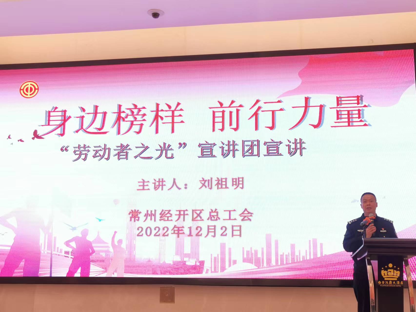 2022年经开区总工会成立“劳动者之光”宣讲团,致力于打造“身边榜样﹒前行力量”品牌。2022年12月02日,宣讲团成员二级英模、全国先进工作者、常州公安局经开区分局刘祖明警官分享他的成长历程。 刘祖明警官不忘初心,坚持把真情、真心换民心,汗水、智慧保一方。他长期扎根基层社区默默无闻,勤恳工作,赢得群众信赖。多年来,几乎放弃了所有节假日休息,早出晚归,深入辖区企业、村民家中服务,在实践中总结出“五问”“四送”“三查”“二帮”“一调”户访工作法,取得较好实效。二十年如一日,扎根基层社区,用真情换取民心,用辛勤创建平安,刘祖明警官赢得了人民群众的信任和支持。 与会人员聆听劳动模范的故事,想着刘警官怎么把不可能变为可能,心底就有信念,眼中便有光彩。与会人员纷纷表示向刘警官学习“爱岗敬业、争创一流、艰苦奋斗、勇于创新、淡泊名利、甘于奉献”的劳动模范精神,从自己做起,从一点一滴做起,从平凡小事做起,以自身实际行动,投身到各自的工作岗位中,锐意进取,务实奉献,为社会的美好明天而奋斗!