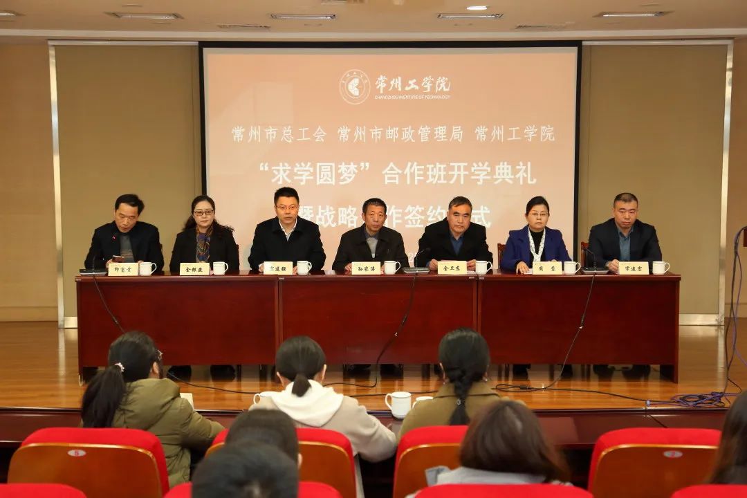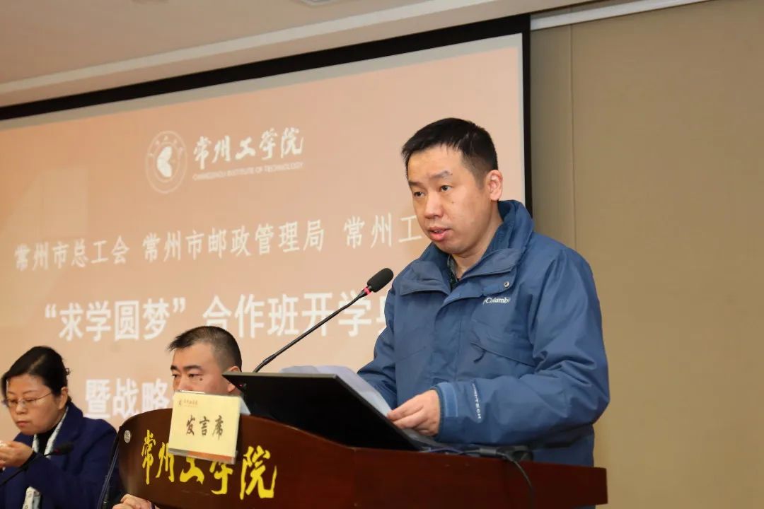 2月25日上午,常州市快递行业“求学圆梦”合作班开学典礼在常州工学院举行,市邮政管理局党组书记、局长孙家涛,市总工会副主席宣建强,常州工学院继续教育学院院长金卫东为“求学圆梦”合作班授牌,常州市邮政管理局副局长周蓉作开学动员。