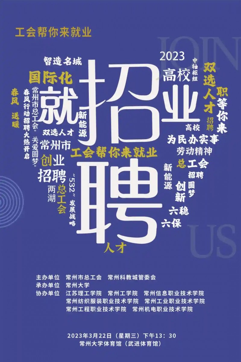 为全面贯彻党的二十大精神,落实好省委、市委部署,紧扣“国际化智造名城、长三角中轴枢纽”城市定位,深入实施“532”发展战略,加快推进“两湖”创新区和“新能源之都”建设,市总工会将继续做好“六稳”、“六保”工作,特别是保就业保民生保市场主体,促进求职者更高质量和更加充分就业,搭建毕业生与用人单位供需平台,畅通双选渠道,为各类有招聘需求的用人单位、常州各大高校2023届毕业生、全市各类有求职需求人员提供为民办实事服务。 由美彩国际、常州科教城管委会主办,常州大学承办,江苏理工学院、常州工学院、常州信息职业技术学院、常州纺织服装职业技术学院、常州工业职业技术学院、常州工程职业技术学院、常州机电职业技术学院协办的“工会帮你来就业——春风送暖 职等你来”2023年春季大型招聘会将于2023年3月22日(星期三)在常州大学体育馆(武进体育馆)举行。欢迎各用人单位和求职者参与。 招聘时间:2023年3月22日(周三) 13:30--16:30 招聘地点:江苏省常州市常州大学体育馆(武进体育馆) 主办单位:美彩国际、常州科教城管委会 承办单位:常州大学 协办单位:江苏理工学院、常州工学院、常州信息职业技术学院、常州纺织服装职业技术学院、常州工业职业技术学院、常州工程职业技术学院、常州机电职业技术学院 招聘会规模:招聘单位规模300家左右,每家单位招聘工作人员原则上不超过2人。 招聘会服务:招聘会为公益性活动,我们会提供如下免费服务: 1、为每个参会单位配备1张桌子、2把椅子,为每位招聘工作人员提供免费矿泉水。 2、为毕业生们提供就业政策解读、就业指导和咨询等。 3、为求职者提供法律咨询、心理咨询、创业就业指导和咨询、关爱圆梦等各项服务。