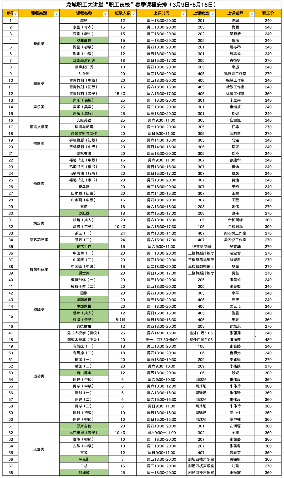 为了更加契合广大职工的需求,我们不断开设新兴课程,增强服务质量,丰富广大职工休闲生活,助力城市更好发展! 参与对象: 工会会员会籍关系隶属于常州市的在职职工(以常州市工会会员数据库为准) 即将开办的春季课程更加精彩,68门梦中情课让我们先睹为快! 注:标绿课程为春季班新增课程