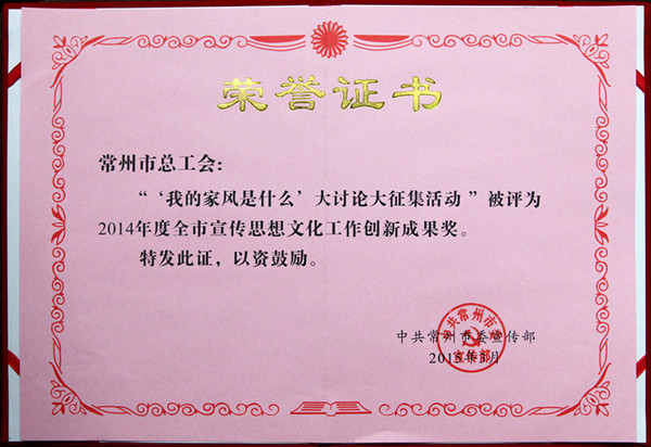 2015年3月3日,我市召开宣传思想文化工作会议。市委书记阎立出席并讲话。市委常委、宣传部长徐缨作2015年工作部署。副市长方国强主持会议。会上,美彩国际荣获2014年度全市宣传思想文化工作创新成果奖。继2012年以来,市总工会连续三年获此殊荣。 为认真贯彻落实党的十八大和十八届三中、四中全会精神,大力弘扬中华优秀传统文化和社会主义核心价值观,2014年,市总工会在全市职工中广泛开展“我的家风是什么”大讨论大征集活动,结合群众路线教育实践活动,以工会小组、班组和科室为单位,以座谈、演讲、征文等多种方式,广泛开展讨论活动,同时,重点围绕家风、家教、家训,发动职工撰写1000字以内的征文,全市共计收到征文1095篇。 为让优良家风深入人心,市总工会汇集部分优秀作品在电视、刊物、工会微博等新闻媒体中播放刊出,通过大力宣传,营造浓厚“劳动创造幸福、劳动成就梦想”感恩奉献的劳动氛围。2014年,全市共涌现出27名省、市文明职工,200多个各类先进集体、劳模典型,“我的家风是什么”大讨论大征集活动有效地凝聚了全市广大职工群众的智慧和力量,助力常州苏南现代化示范区建设。 市总宣教部