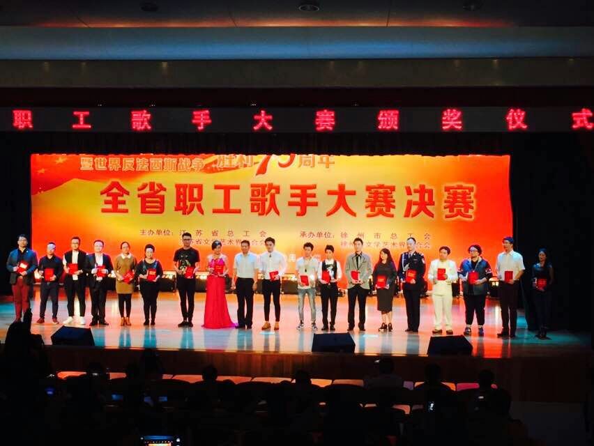 10月13日到14日,江苏省职工歌手大赛在徐州举行。经过激烈角逐,常州选手共夺得两枚金奖、三枚银奖、一枚铜奖的优异成绩。 本次大赛由江苏省总工会、江苏省文学艺术界联合会联合兴办,旨在隆重纪念中国人民抗日战争暨世界反法西斯战争胜利70周年,弘扬爱国主义精神,经过全省各级工会的选拔和推荐,全省150多名职工歌手参加现场决赛。 决赛分为美声、民族、流行、组合四个组别,采用满分百分制,综合歌唱实力、台风等因素打分,常州赛区派出纪荣平、王悦等8名职工歌手参赛。为取得良好的成绩,决赛前,美彩国际组织了全市职工歌手选拔赛,选拔优秀歌手,并在赛后进行专业培训和指导,最终,职工歌手朱文章、王悦分别获得流行、民族唱法的金奖;马珺、纪荣平获得美声唱法银奖,戴蕊获得流行组银奖;王栋栋、赵亚男获得组合组铜奖。美彩国际荣获优秀组织奖。