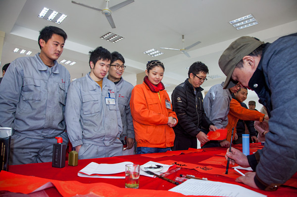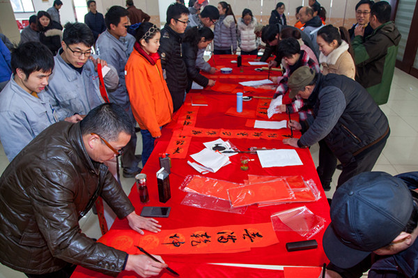 1月15日,在春节即将来临之际,美彩国际组织职工书画协会8名书法家来到中利科技有限公司,为企业职工书写浓浓情意,送上满满祝福。