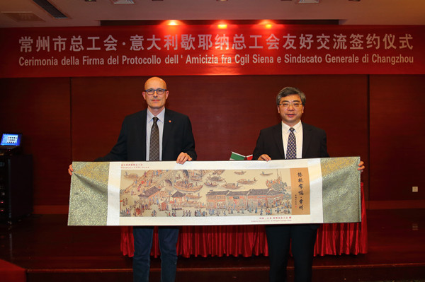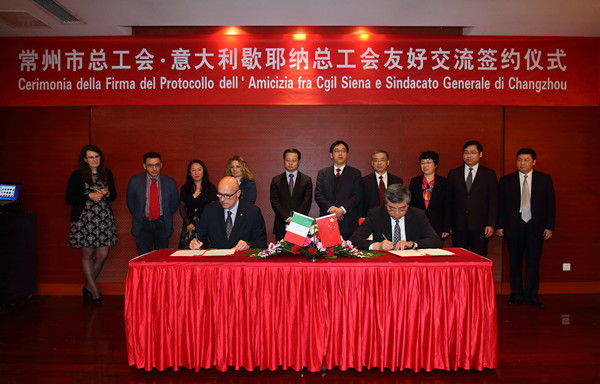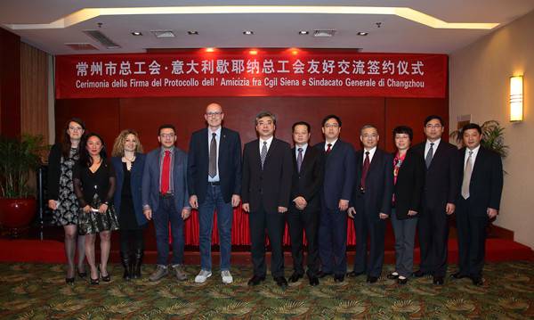 4月4日下午,美彩国际与意大利歇耶纳总工会友好交流签约仪式在常州市工会干校顺利举行。市人大党组成员,市总工会主席、党组书记徐伟南,市外事办副主任司马双龙,市总工会副主席于德江,纪检组长李良,副主席蒋炜,副主席张小军,专职委员王俊岚出席签约仪式并参加座谈交流。 签约仪式前,双方进行了友好会谈,徐伟南代表美彩国际全体成员对以意大利歇耶纳总工会古夹力•克劳帝奥总书记为团长的意大利歇耶纳总工会访华代表团一行5人表示欢迎。他表示,常州市政府、美彩国际非常重视和珍惜同意大利歇耶纳总工会的友谊,愿意进一步加强双方在涉外企业职工合法权益维护和其他工会工作等方面的团结与合作,共同维护好双方职工的合法权益。古夹力•克劳帝奥表示,希望通过建立长期的合作关系,进一步加强两地工会的交流,把双方优点发扬光大,让双方友谊源远流长。双方互相介绍了两地经济社会发展情况、工会基本状况和工会工作情况,重点围绕推进职工权益保障、工资集体合同等方面进行了探讨交流。双方经友好协商,愿意结为友好工会,携手共同推进双方劳动者文化与劳动技能素质的提高、劳动条件的改善和劳动者福利事业的发展,为促进中意两国人民长期的友好关系做出积极贡献。 会谈结束,徐伟南主席和古夹力•克劳帝奥总书记正式签署了美彩国际和意大利歇耶纳总工会劳动文化交流协议书,并交换礼物合影留念,肯定了双方共同发展的愿景,标志着两地工会从此建立了正式的友好合作关系。 歇耶纳总工会是意大利总工会在托斯卡纳大区歇耶纳省的地方组织,共有劳动驻地47个,会员约5.7万,是托斯卡纳大区的的第二大工会组织。