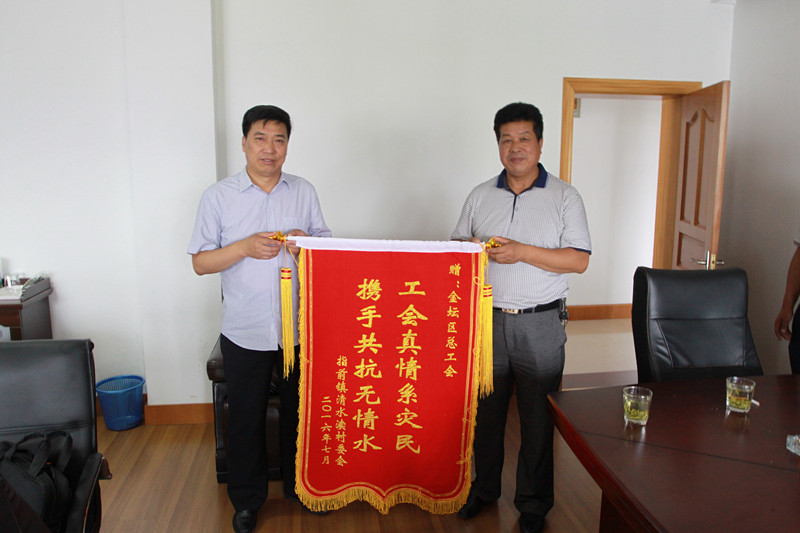 7月29日,金坛区指前镇清水渎村委将一面印有“工会真情系灾民,携手共抗无情水”的锦旗送到区总工会主席、党组书记冯锁强手中,以表达对区总工会第一时间支援清水渎抗洪救灾的感激之情。入汛以来,金坛区局部地区洪涝严重,区总工会深入一线抗洪救援,走访慰问受灾企业,组织志愿者赴临时安置点开展帮扶活动。 (金坛区总工会)