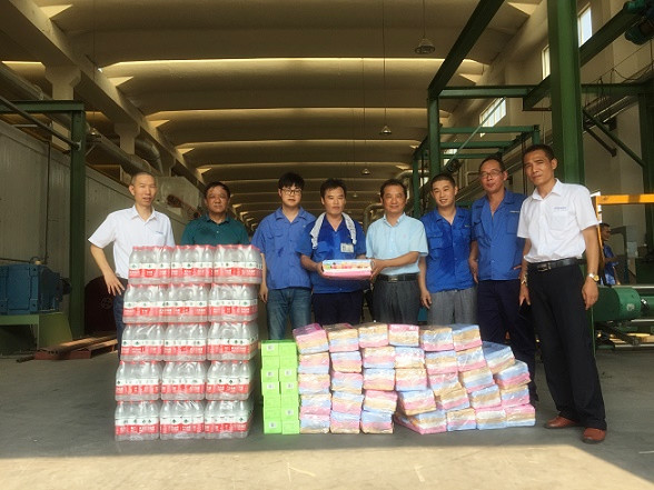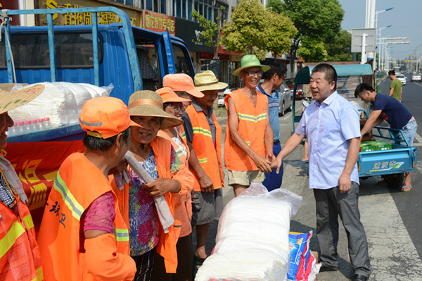 7月27日,2016年入夏第8个高温天,烈日炎炎、热浪滚滚,给坚守一线岗位的工作人员带来很大考验。 27日上午,奔牛镇总工主席张玉,看望、慰问高温天气坚守一线岗位人员,送去消暑慰问品,叮嘱单位领导,要合理调整作息、预防高温中暑。 广大环卫工人冒着高温酷暑坚持户外作业,保障了街容街貌的整洁卫生。在奔牛集贸市场歇脚点,张主席给在这里坚守工作的环卫工人送去慰问品,并叮嘱大家:环卫工人大都年龄较大,而室外温度又较高,大家在外边工作非常非常辛苦,要合理安排好时间,按上级有关精神,尽量避免中午11点到下午3点之间户外工作,要多喝水、多休息,万一感觉到不舒服了,要及时休息、吃药,不要硬撑,确保安全度夏。 随后,张玉主席又到大江饲料、阳湖电缆等企业进行了慰问,要求企业积极做好防暑降温工作,严格落实有关制度,加强对工人的安全教育,做到战高温抓进度保质量同时不忘重安全。