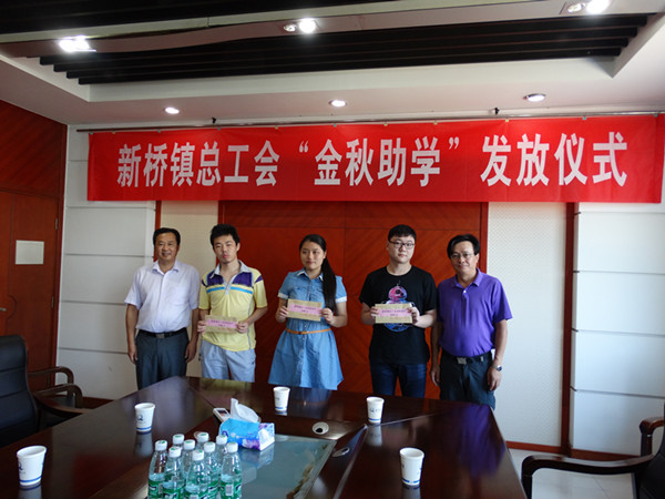 8月30日上午,镇总工会于镇政府303会议室举行新桥镇总工会金秋助学发放仪式,贫困大学生接受了助学金资助,缓解升学经济压力。 助学仪式上,镇总工会主席卢伟荣,鼓励他们勇敢地接受生活挑战,不断超越自我,在青春的路途上,满怀勇气,不畏艰辛,向着心中的梦想微笑前进。