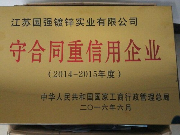 | 江苏国强镀锌实业有限公司喜获国家 工商总局“守合同重信用”企业 |