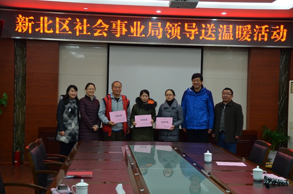1月17日上午,新北区社会事业局党工委副书记、副局长苏传瑾,新北区社会事业局副局长、教育文体局局长杨杰、教育处处长蒋辉、新北区教育工会主席臧亚东、副主席董小方等领导分两组慰问了学校困难教职员工,送上真切的关怀和问候。 领导们不仅为困难教职工送上慰问金,更与他们促膝交谈,详细地询问了他们的家庭状况、身体情况和存在的实际困难,鼓励他们要振作精神,增强信心,以乐观的心态面对生活的挑战,努力战胜困难,并为他们送上了诚挚的新年祝福。领导们的真诚关怀暖人心间,被慰问的老师们深表感谢。他们纷纷表示,感谢领导的慰问和关怀,他们对生活依然充满信心,对工作依然充满热情。在接下来的生活和工作中,他们将以最积极乐观的心态来坦然面对挑战,战胜困难,尽力做好本职工作,用实际行动回报各方的关爱,为教育事业的发展贡献力量。 新北区社会事业局、教育工会一向高度重视对患大病、重病及困难教职工的帮扶工作,对区内困难教职工尽力做到知情暖心。通过区教育工会联合会不断完善帮扶机制,提升帮扶实效。2016年度,区教育工会联合会共慰问困难教职工60人,发放慰问费22.8万元;慰问困难退休教职工68人,发放慰问费40800元,体现了教育大家庭的温暖。