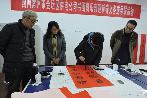 1月17日下午,金坛区供电公司员工活动中心二楼,区著名书法家范石甫、陈曦和公司书画俱乐部部分成员齐聚一堂,以书法寄新春,以笔墨书祥和,为公司员工义务写春联。 “闻鸡起舞、跃马争春”、“喜鹊登枝迎新春,金鸡起舞报福音”……一副副苍劲有力、寓意吉祥的春联顷刻间一气呵成。活动现场吸引了众多员工,大家纷纷为书法家们的书法技艺喝彩,书画俱乐部的会员们围聚在书法家们身边,认真地领略他们挥笔之中的韵味,忙不迭地帮着铺纸、倒墨,仔细地品评每一副春联,同时书法家们也不时的为会员们点评指正,现场顿时染上了一缕浓浓的笔墨清香。现场充满了欢声笑语,来到现场的员工们“满载而归”。 (金坛区供电公司工会)