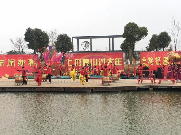 龙腾狮跃、木屋度假、喜宴欢笑、祈福祷寿……鸡年春节,溧阳曹山旅游度假区呈现一片繁荣兴旺景象。为让游客度过一个欢乐、祥和的安心年,春节前,由曹山度假区工会牵头,联合公安、消防、安监、城管、市场监督管理等部门,对景区、旅游交通、四家三星级宾馆等场所,进行了全面安全隐患排查;假日期间,各有关单位全天候、全方位分工协作,实时把有关天气趋势、交通信息、景区游客指数提供给游客,确保游客在曹山旅游无障碍和特约商户服务质量进一步提升;旅游咨询、投诉电话全天候开通;度假区内交通顺畅,秩序井然;实现了“安全、秩序、质量、效益”四统一的目标和“人气”、“财气”双丰收。 在曹山度假区工会组织和保驾护航下,曹山度假区正月期间顺利举办了丰富多彩的旅游节庆活动,活动异彩纷呈,氛围热情浓郁。初一至初八,特约商户日日春农庄推出舞龙舞狮表演,多次获得全国龙狮锦标赛冠军的常武龙狮精彩的腾空、跳跃等惊险动作博得了观众如潮的喝彩和掌声,独具地域特色的“非遗展演”--将军马灯、龙灯等则向游客展示了曹山一带的民情风俗、历史故事。上兴人自编自导的元宵节联欢会更是获得游客和本地居民的好评。