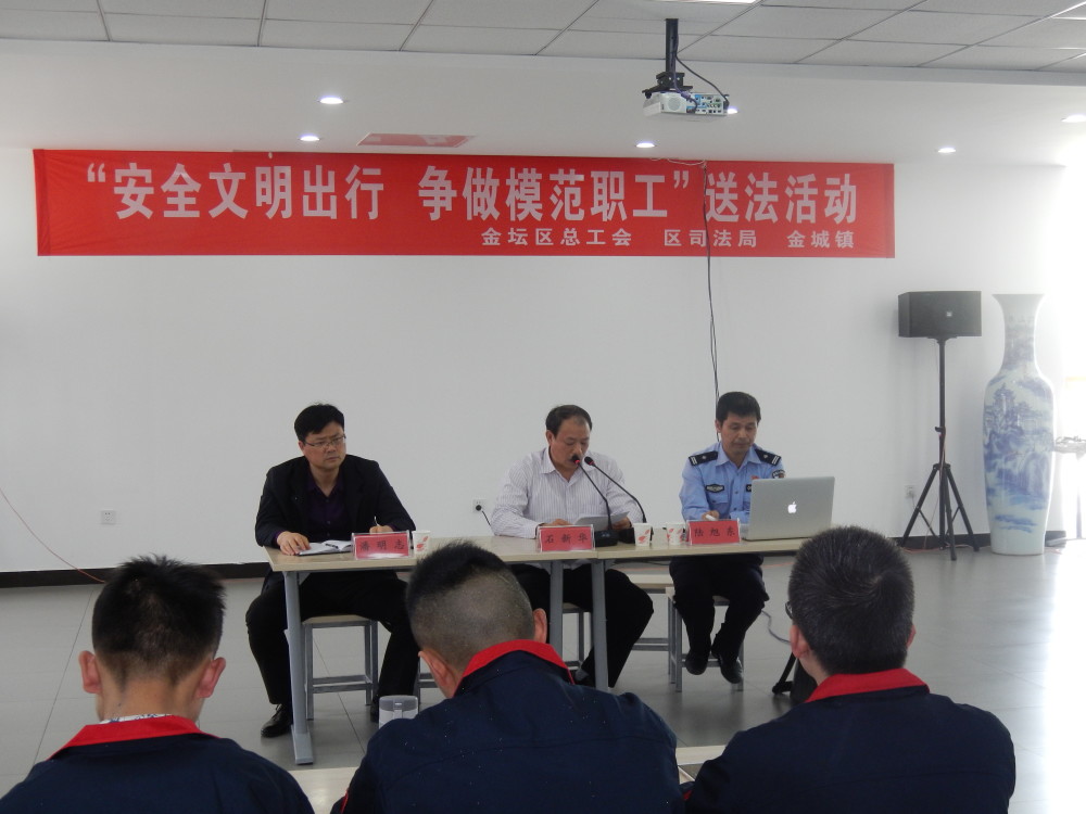 为让广大职工了解交通安全新法规的基本内容和原则,提高职工道路交通安全法治意识,4月18日下午金坛区总工会联合区司法局、金城镇总工会,面向企业职工,在江苏索特动力工程有限公司开展以“安全文明出行,争做模范职工”为主题的“送法进企业”活动,共有八十多名镇村企三级工会干部和企业职工参加了活动。 区总工会邀请了区交警大队秩序中队指导员陆旭东警官为大家授课,陆指导员采取“以案释法”的形式授课,从如何安全驾驶、最新交通法规、事故责任认定等方面,深入浅出地为大家讲解了交通法规知识,按照常见交通事故责任划分,如何应对交通事故,如何认定交通事故工伤的等方面为大家授课,讲课非常的精彩。 与会人员听的非常认真,借宣传交通法规的良机,提高了全镇职工和工会干部对交通新法规的知晓度,进一步提高了职工安全防范意识,此次活动受到广大职工朋友的一致好评。