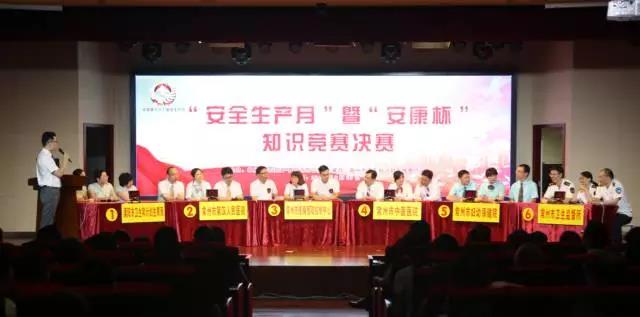 为全面落实安全生产主体责任,6月29日下午,经过为期一个月的筹备、组织和预赛,由市安委办和市卫计委联合举办的“安全生产月”暨“安康杯”知识竞赛决赛正式开赛。从预赛的21支参赛队中脱颖而出的6支队伍展开了激烈角逐。 市卫计委党委书记、主任朱柏松、党委副书记何小茜、副主任姚福建,市安监局副局长陈卫兵,市总工会副主席蒋炜、市卫生计生工联会主席郝锦以及各辖市区卫计局、委属单位的负责人和职工代表等260余人现场观摩。来自市安监、总工会、消防支队的专家担任了竞赛仲裁。 市卫计委党委书记、主任朱柏松出席观摩并致辞, 要求各地各单位时刻保持清醒认识,强化“红线”意识,时刻绷紧安全生产这根弦。就做好下阶段安全生产工作,朱主任强调: 一是思想认识再强化,保持“如履薄冰、如临深渊”的危机感; 二是主体责任再明晰,主要负责人要“想安全”,管理人员要“会安全”,干部职工要“懂安全”; 三是高危领域再排查,切实加大督查治理力度,努力把事故遏制在萌芽状态。 决赛经过必答、抢答和风险题等三个阶段的竞技,最终, 常州市第四人民医院获团体一等奖,常州市妇幼保健院、常州市疾病预防控制中心荣获团体二等奖,溧阳市卫计局、常州市中医医院、常州市卫生监督所荣获团体三等奖. 常州市第二人民医院的薛瑶等十位选手获得“十佳”选手称号。 赛前,各位领导饶有兴趣地观看了全市卫生计生系统“安全生产月”活动图片展。今年的安全生产月活动开展以来,常州市卫计委围绕活动主题,开展了一系列形式多样、内容丰富的安全生产宣传活动。 经统计,全市卫计系统共组织开展宣传咨询、警示教育、应急演练、主题宣讲、安康杯竞赛、知识竞赛、专项整治、专家服务、学术研讨、平安创建等12大类200余项活动,共有2.3万余人次接受了安全教育。