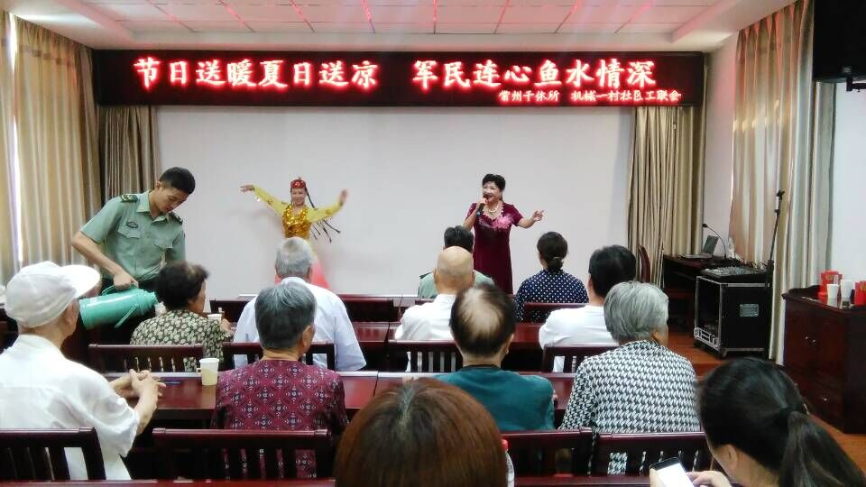 7月29日,钟楼区荷花池街道总工会携机一社区工联会来到解放军总装备部常州干休所,走访慰问干休所全体离休干部和部队官兵、工作人员,把工会“清凉一夏、幸福安康”为主题的夏日“三送”系列活动送到了的干休所全体离休干部和部队官兵、工作人员手中。 “三送”活动以一场精彩的演出为载体拉开了序幕。“节日送暖夏日送凉,军民连心鱼水情深”——在鲜红的电子屏标语下,一曲双人舞《沂蒙颂》一下拉近了军民间距离。男声独唱《很远很远的地方》、歌伴舞《吐鲁番的葡萄熟了》、剑舞《长城长》——一曲曲精心编排的节目展现出表演者对革命军人的深厚感情。演员们深情的演绎、扎实的功底博得了台下观众阵阵热烈的掌声。 常州方言说唱节目《讲礼貌》把职工安全、法律知识完美地融入到了诙谐幽默的表演中,从正、反事例对比中,生动形象普及了专业知识。观众们不时报以会心的笑声和热烈的掌声。 在节目最后,街道和社区工会工作人员为全体离休干部和部队官兵、工作人员送上了防暑降温用品。 干休所刘政委对这台内容精彩、内涵丰富的节目表示出热烈的欢迎,对送来的防暑降温用品表示感谢,并且对街道、社区长期以来的关心和帮助表达诚挚的谢意! 工会“三送”,军民连心!愿我们的系列活动能为我们最可爱的人送去工会的一份情、一片心!愿军爱民,民拥军,军民鱼水之情代代传承!
