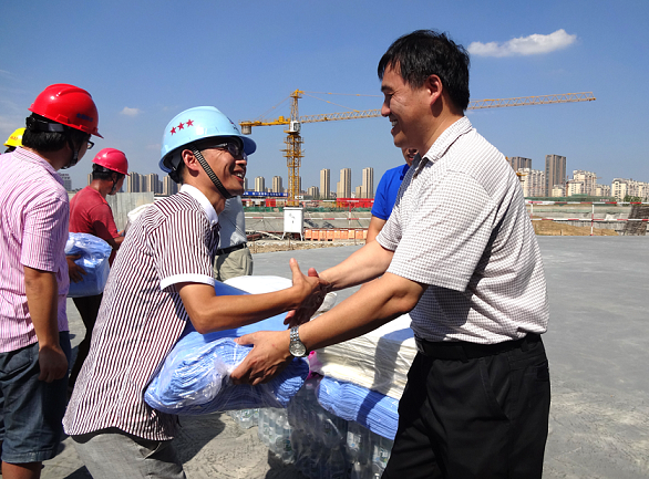 7月28日,区总工会副主席胡九宏、办公室主任王晨飞一行顶着高温来到常州科技金融中心项目工地现场,看望慰问高温下坚守岗位的一线工人,为他们送去组织的关怀。常高新集团党委副书记、工会主席蒋忆桥、集团副总经理、国展房地产公司总经理卢金河陪同慰问。 在慰问中,胡主席向高温天气下坚持工作的项目建设者们表示了诚挚的慰问,叮嘱大家在工作的同时,要注意身体健康和劳动安全。卢副总经理要求项目建设单位要合理调整作业时间,要加强工地安全施工和职工自身安全教育,做好应急人员的安全培训,尤其要加强应急处置过程中的安全防护工作,防止安全事故发生。最后,慰问组为一线工人们送上毛巾、肥皂、盐汽水、防暑药品等。