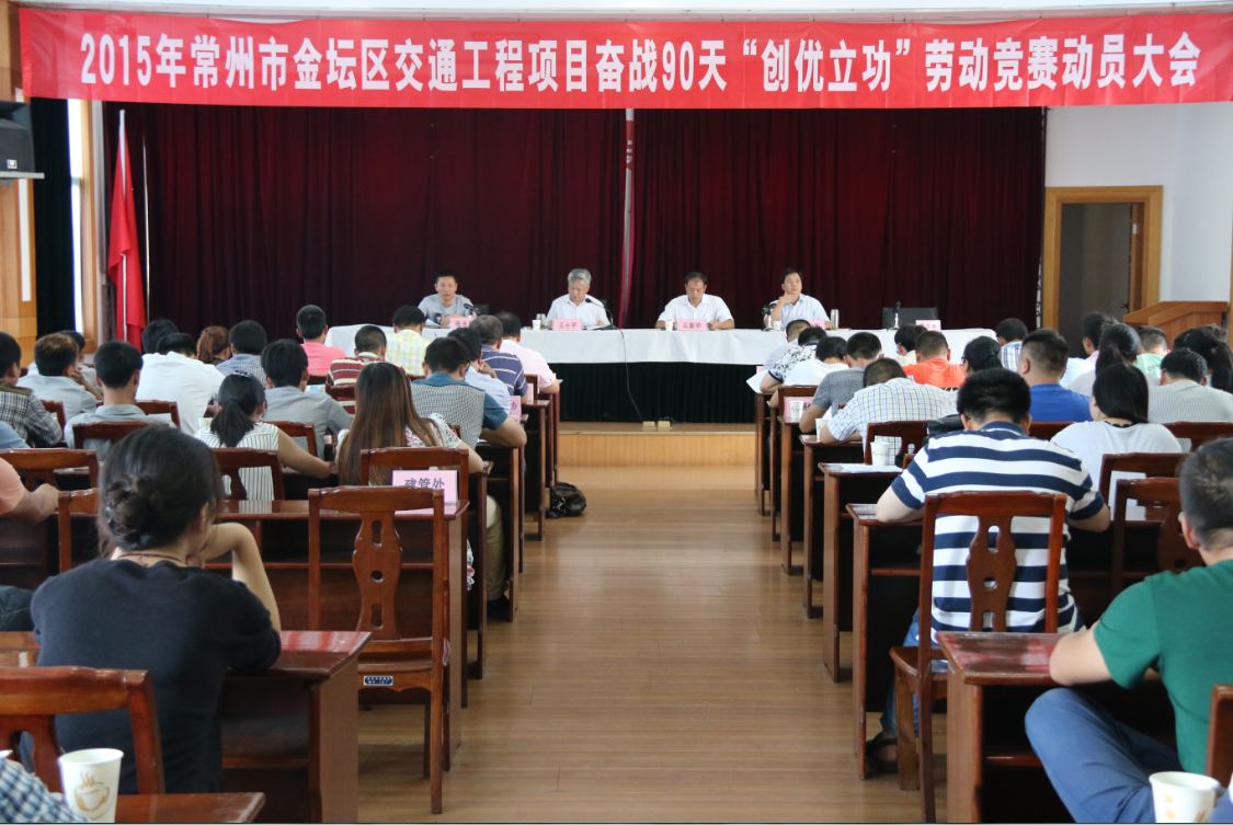8月14日下午,常州市金坛区交通运输局召开“常州市金坛区交通道路工程项目奋战90天‘创优立功’劳动竞赛”动员大会。金坛区总工会副主席石新华、局党委副书记王小平、副局长孙俊华应邀出席。此次劳动竞赛的参赛单位为目前在建道路的施工项目部和总监办,竞赛以“比质量最优、赛进度最快、争安全最好、创文明最佳、保作风最廉”为主题,在保证工程质量、安全的情况下,掀起大干快上的施工热潮,90天竞赛内计划完成施工产值约1.2亿元。 (金坛区交通局工联会)