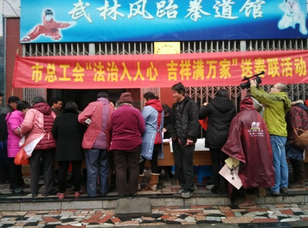 1月11日上午9时许,别桥镇文化体育中心翰墨飘香,人头攒动,从四面八方赶来的群众把体育中心门前围得水泄不通,热闹非凡。原来,新春伊始,溧阳市总工会为满足广大职工群众的法治文化需求,不断丰富普法宣传的形式和载体,在全市开展面向广大职工群众的“法治入人心、吉祥满万家”送春联活动,特邀了6名市书法家协会成员在文化体育中心现场挥毫泼墨,精心书写法治春联,为广大群众送去猴年新春的祝福。同时市总工会还为前来领取春联的群众发放了劳动法律法规宣传册,群众纷纷对工会工作竖起了大拇指:“这样的活动真好,省得我们再去买春联了。” “政通国盛千家富,法治人和九域安”、“法治国家臻大治,清明社会倡文明”……一幅幅崇法春联走进了千家万户。据悉,此次送春联活动把法律知识融于春联之中,把法治文化与传统文化相结合,既增添了喜迎春节的氛围,又使广大老百姓在潜移默化中受到了法治教育,增强了法治观念。该项活动将一直持续到1月22日,在全市十个镇(区)陆续开展。(葛圆幸) |
