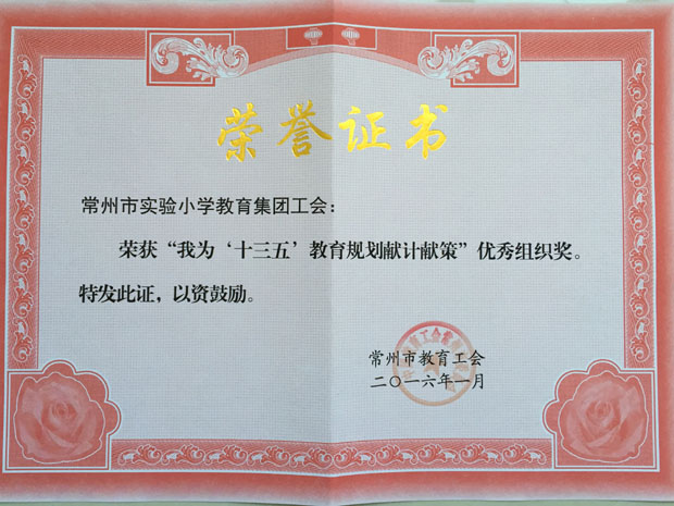| 广开言路献计策 集思广益绘蓝图——常州市实小教育集团荣获市“我为十三五教育规划献一计”活动优秀组织奖 |