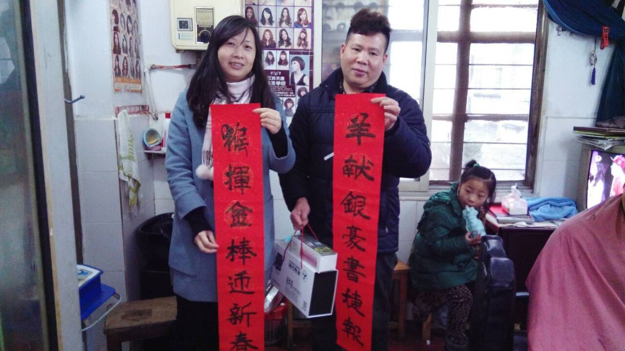 为了弘扬他们的敬业精神,感谢他们为这个城市付出的辛勤与汗水,钟楼区荷花池街道总工会副主席王霞在社区工联会何冬梅的陪同下,来到辖区个体工商户周明理发店,为他们送去一份新春的祝福。商户周明激动得连声道谢:“谢谢工联会的关心!”