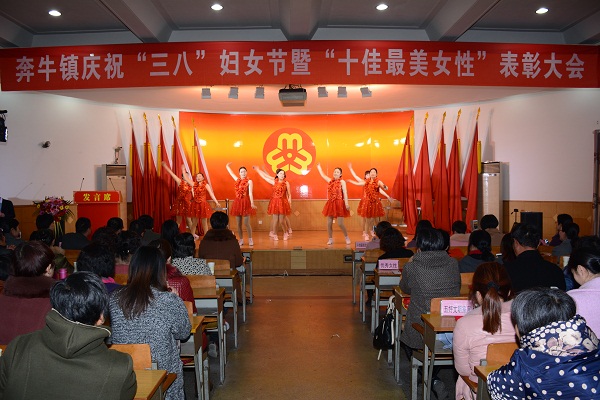 3月3日下午,奔牛在镇政府组织了庆“三八”暨“十佳最美女性”表彰大会。 为聚集“她力量”,绽放“她风采”,放大“她效应”,激励更多女性比学赶超,为奔牛发展助力添彩,奔牛镇妇联、总工会在企事业单位各条线职工会员中开展“十佳最美女性”评选工作,最终江苏武进液压启闭机有限公司工会主席房翊、奔牛实验小学曹伟芳等10人被评为2015年度“十佳最美女性”。 在表彰会上,以ppt图文并茂形式,宣传了她们的事迹,并对她们进行了颁奖。 会上,还安排了一台文艺表演,庆祝“三八”妇女节。
