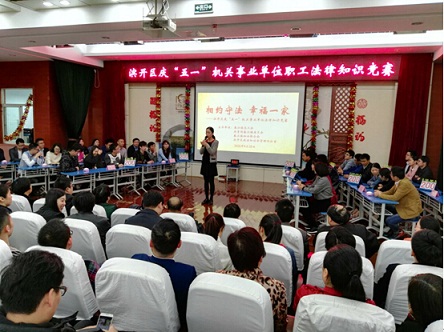 为贯彻落实依法治国方略,进一步弘扬法治精神、培育法治文化,引导机关干部职工了解国家法律体系,强化法律意识,提高法律素养,推进依法行政,4月28日下午,春江镇总工会、团委、妇联会同滨开区政法和社会管理办公室联合举办“相约守法•幸福一家”机关事业单位职工法律知识竞赛活动,庆祝“五一”劳动节。