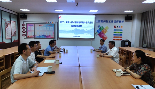 7月3日下午,武进区总工会党组书记沈涛、副主席张勇、保障部部长陈伟平一行来湖塘镇调研职工(劳模)技术创新专项集体合同签订落实情况,镇总工会主席叶平陪同。