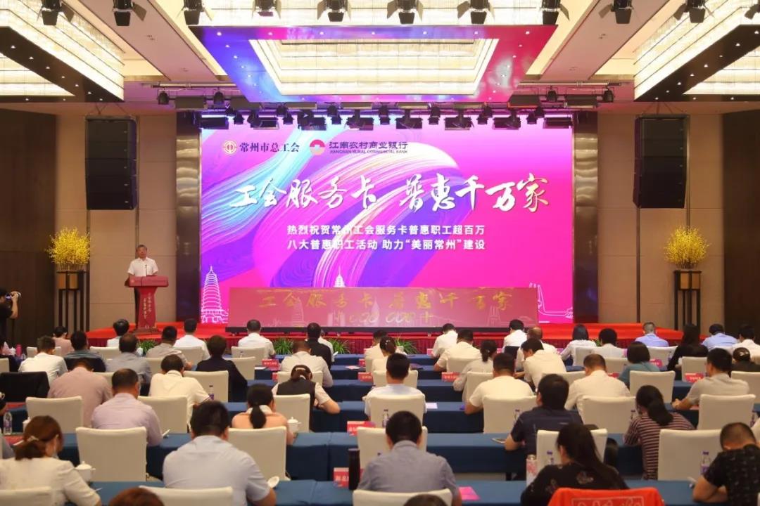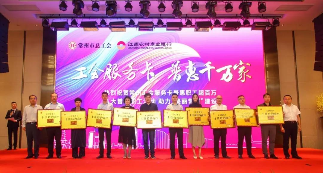 金秋时节,瓜果飘香。9月22日,美彩国际举行“工会服务卡普惠千万家”庆祝常州工会服务卡普惠职工超百万暨特约商户座谈会活动。常州市政协副主席、市总工会主席徐伟南到会讲话;江南农村商业银行党委书记、董事长陆向阳致辞;市总工会党组书记、副主席华飞,江南农村商业银行行长王晖东共同为常州市五星电器有限公司、苏宁易购常州公司、合和圆缘食品公司、江苏明都超市有限公司常州明都连锁店、常州月星国际家居广场有限公司等“十佳特约商户”授牌;市总工会、江南银行领导为“百万工会卡”揭幕。常州工会服务卡“十一黄金周”八大普惠职工活动同时发布。