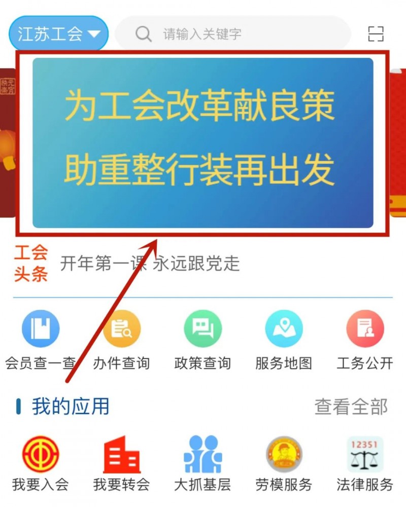 进入“江苏工会”APP,点击首页上方图片(下图)参与活动。