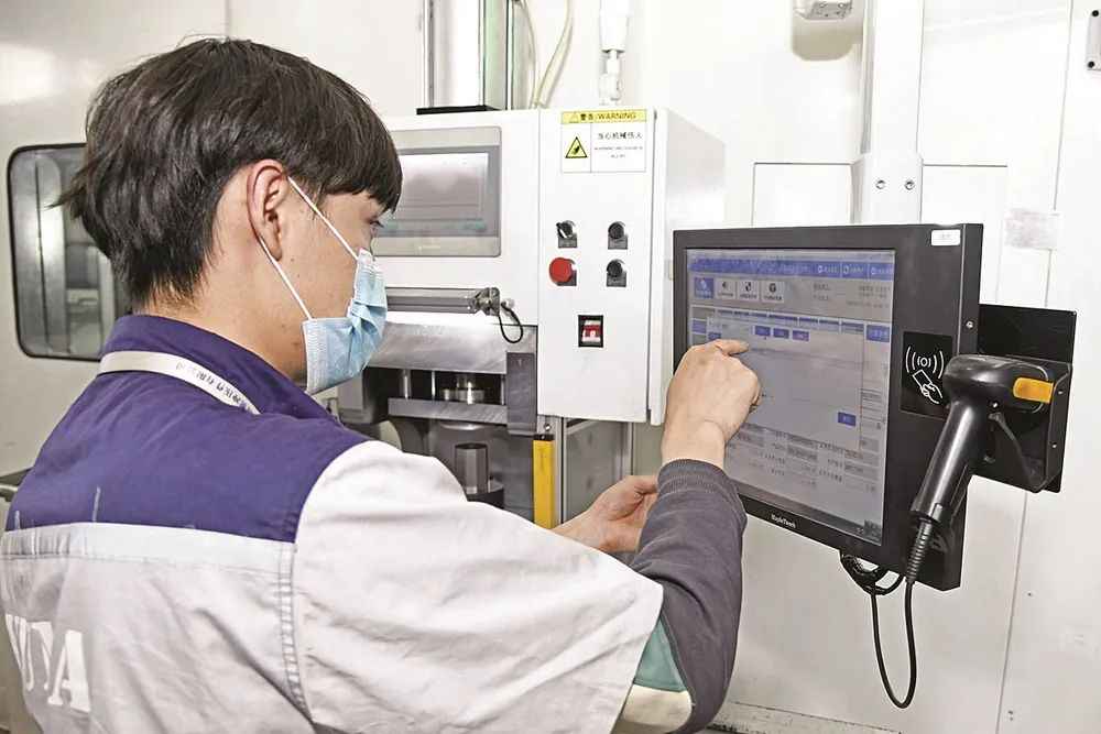 “滴——”生产线上,冲压生产部工会职工刘梦磊手持PDA扫描枪,在一台设备上扫了扫,设备显示屏上,开工、生产投料、接收和首检等工序流转的各类数据立刻跳出来。刘梦磊点击屏幕,查询订单冲压的生产活动情况,确认无误后,转给下一道工序。