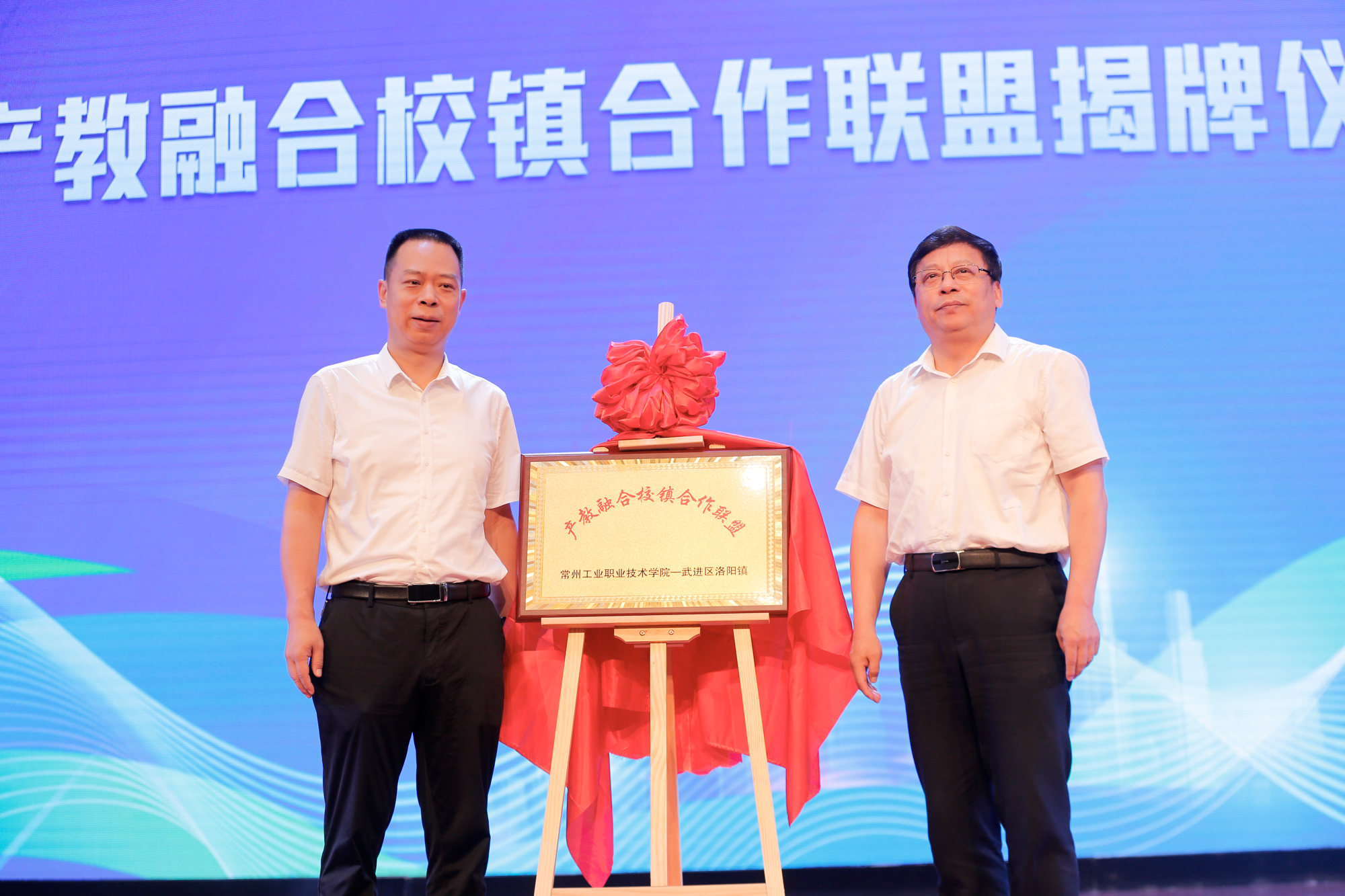 缪昌武、潘宏杰共同为产教融合校镇合作联盟揭牌。