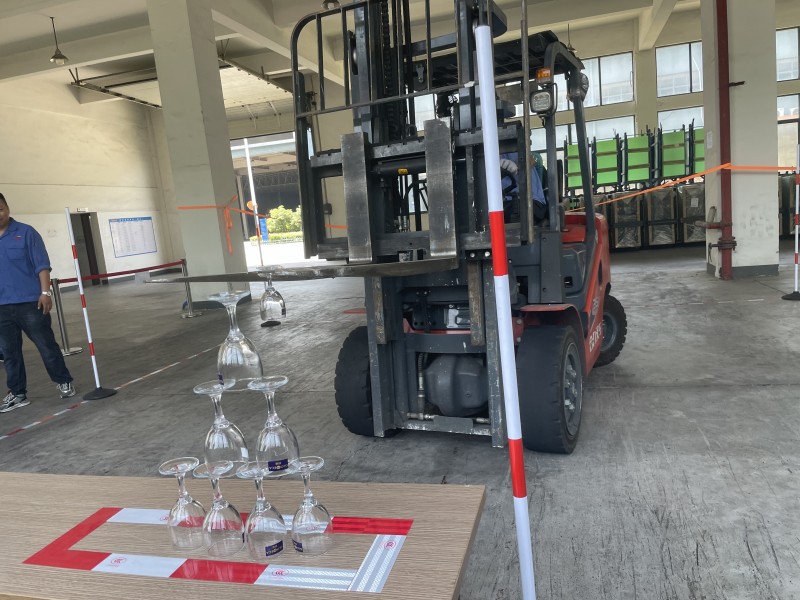 本次竞赛包括培训学习、理论知识考试和实际技能操作三部分内容。33位参赛选手通过对叉车相关技能课程学习和理论考试,对叉车专业知识和安全操作驾驶有了更深入的了解。在叉车实操比赛中,选手们需要将8个“高脚杯”从出发点依次拿到指定地点进行叠放。他们为拿高分尽可能的将杯子堆叠成“金字塔”,但只要操作稍有不慎,杯子就会落地摔碎,影响最终比试成绩。选手们屏气凝神,动作敏捷,熟练地倒车、转弯,快速准确、平稳地将杯子叠放起来,仿佛可以从中看到他们平时在作业现场中忙碌的身影。现场观众不由地为选手们的高超技艺欢呼喝彩。