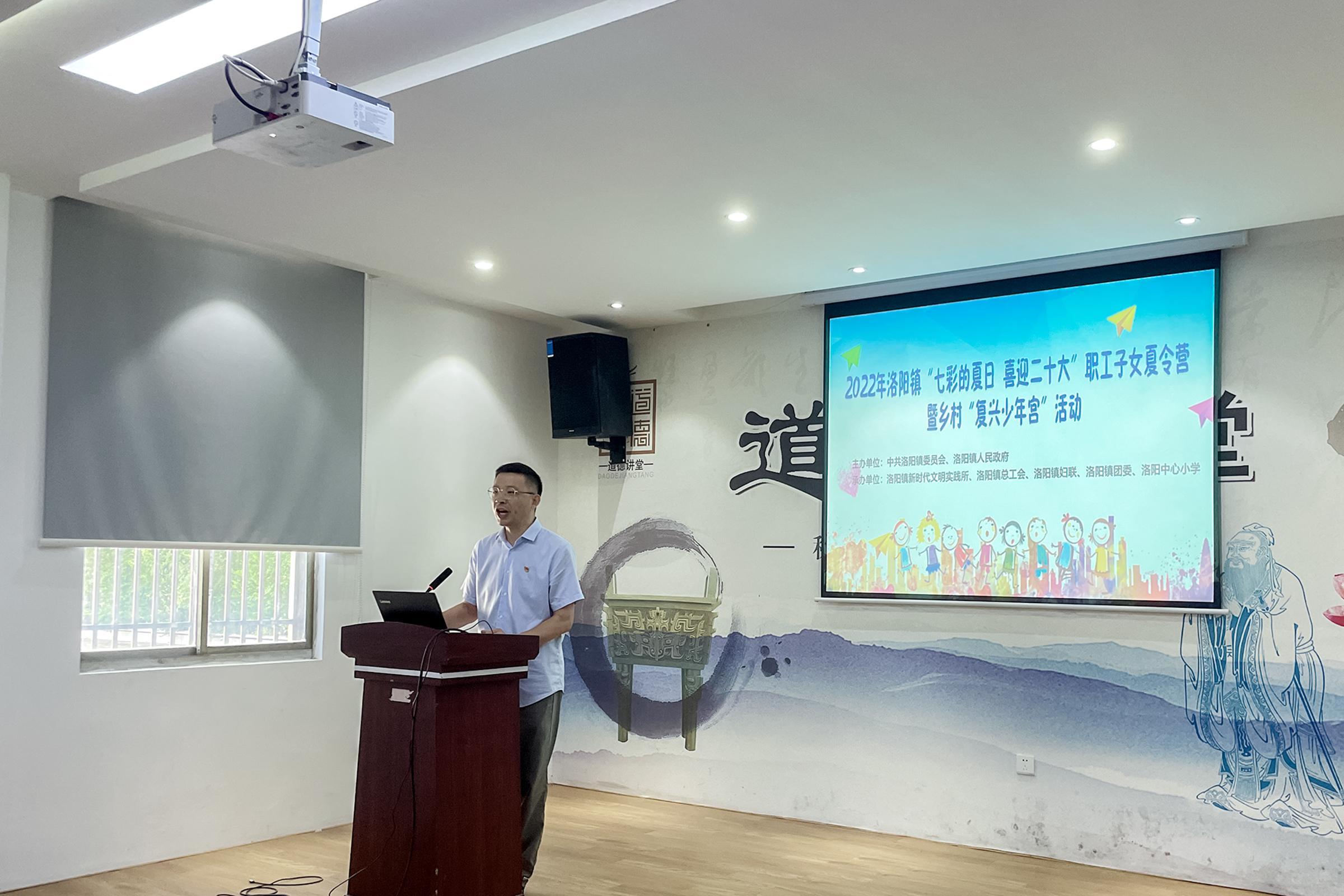 7月4日上午,由中共洛阳镇委员会、洛阳镇人民政府主办,洛阳镇新时代文明实践所、镇总工会、镇妇联、镇团委、洛阳中心小学联合承办的2022年洛阳镇“七彩的夏日 喜迎二十大”职工子女夏令营暨乡村“复兴少年宫”活动在洛阳镇新时代文明实践所道德讲堂正式开班。镇党委副书记薛文伟、副镇长候选人邱添、镇总工会主席费叶青等相关领导出席开班仪式,大学生志愿者、小朋友们和家长们参加开班仪式。