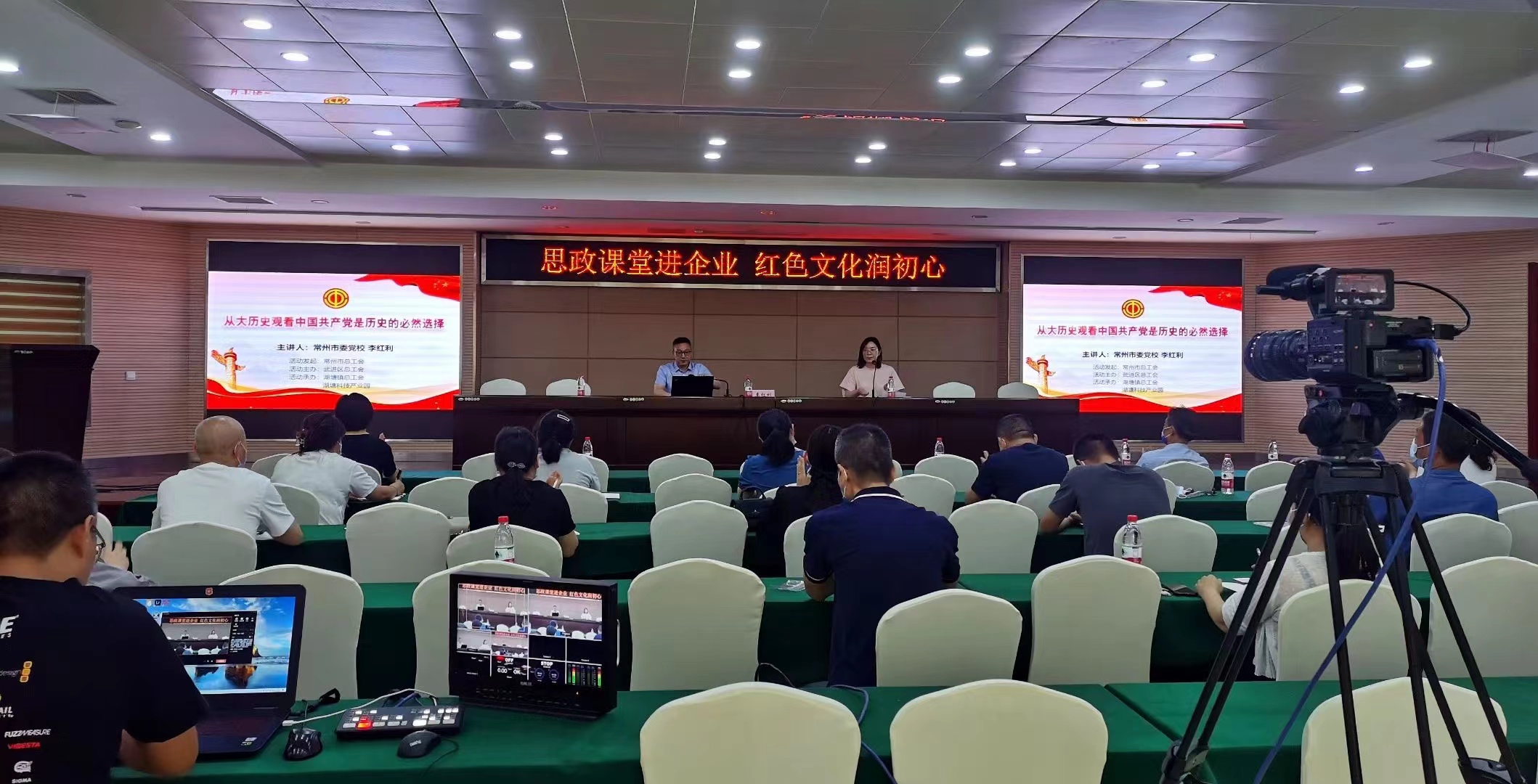 为迎接党的二十大胜利召开,进一步做深做实思想政治引领工作,让党的声音传递到每位职工身边,7月6日下午,“思政教师进企业”活动走进湖塘科技产业园。活动邀请中共常州市委党校基础理论教研室主任、副教授李红利为广大职工讲授《从大历史观看中国共产党是历史的必然选择》课程。因疫情影响,本次活动采用“线上+线下”方式进行,活动现场的企业职工代表与屏幕前的广大职工群众共同参与本次讲座。