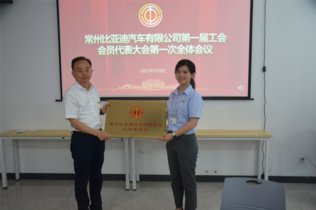 刘卫国为常州比亚迪工会授牌;与会领导与会员代表共同宣誓,并为会员代表颁发工会会员证、佩戴工会会徽,共同合影留念。会后,刘卫国一行听取了常州比亚迪汽车有限公司生产经营情况介绍,现场参观了生产车间和产品流水线。