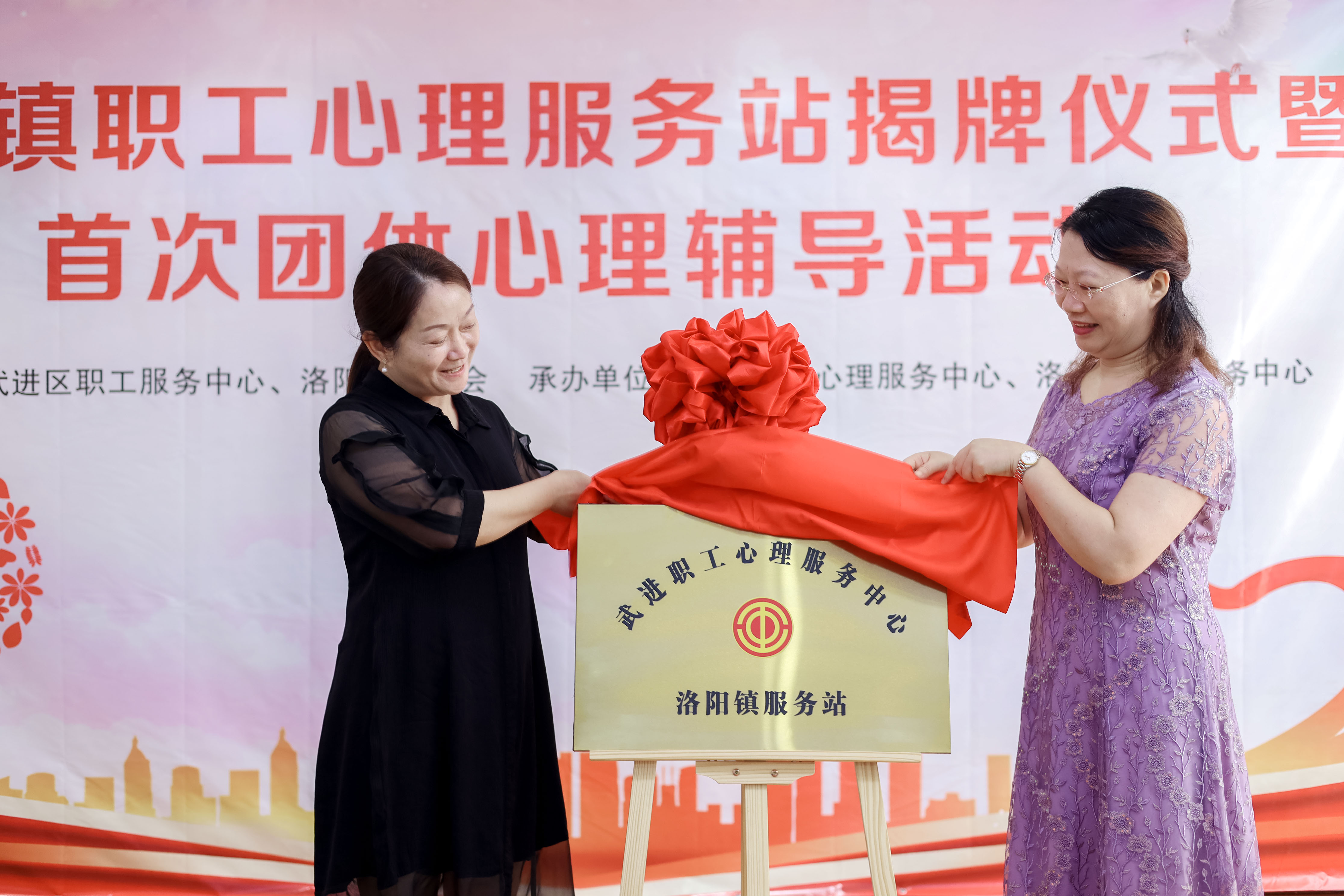 进一步加强职工心理健康服务体系建设,守护全镇广大职工心理健康,7月21日上午,洛阳镇职工心理服务站揭牌仪式暨首次团体心理辅导活动在洛阳镇新时代文明实践所举行。武进区总工会副主席陆惠萍,洛阳镇总工会主席费叶青,武进区职工服务中心副主任白宗芹参加活动。