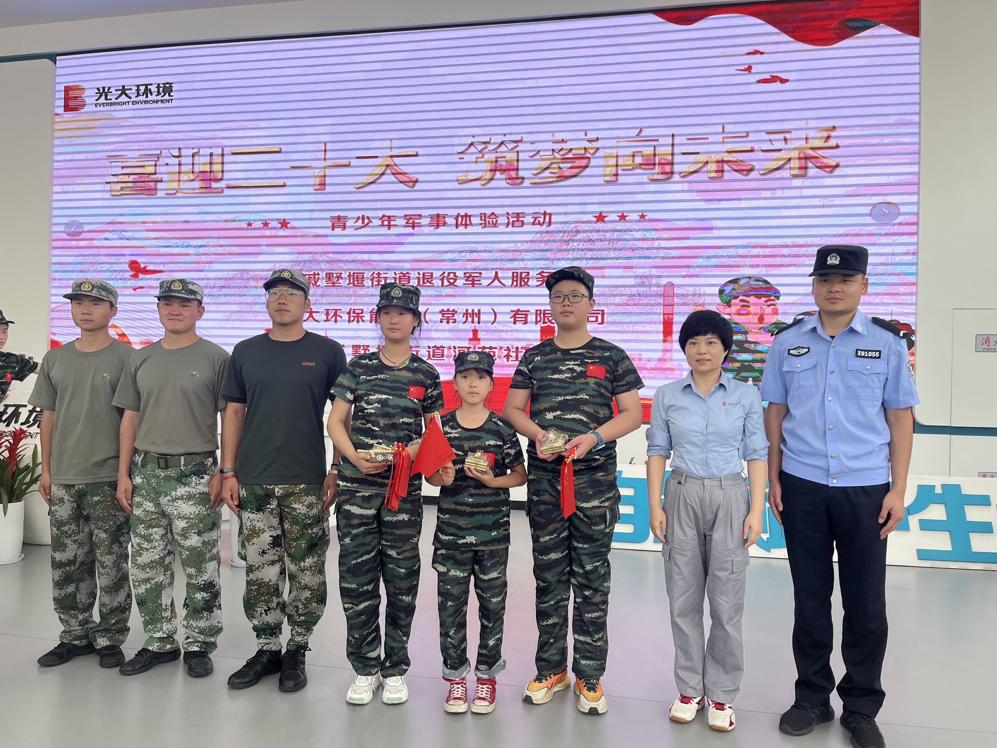 2022年7月27日下午,常州经开区戚墅堰街道河苑社区联合戚墅堰街道退役军人服务站、光大环保能源(常州)有限公司组织40余名职工子女在光大环保篮球场开展“喜迎二十大 筑梦向未来”青少年军事体验活动。