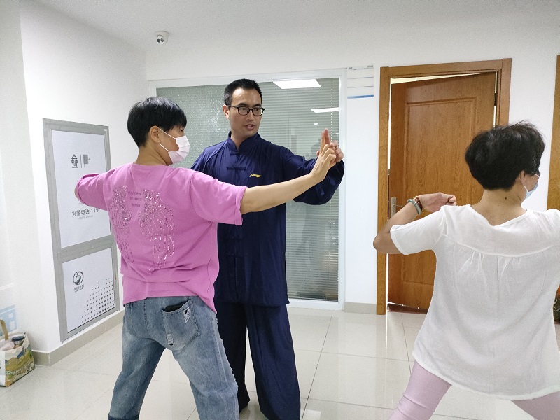 为助力社区工联会建设,切实服务工联会会员、提升凝聚力。曙兴社区工联会组织开展了“快乐八段锦 健康我引领”健身功学习活动。本次活动特邀常州工学院体育专业的程国海老师到现场指导教学。“意守丹田,宁静心神,调整呼吸,端正身型……”,伴随着悠扬悦耳的音乐声,程国海老师为会员们示范“八段锦”基本动作,老师一边为大家讲解动作要点一边仔细帮助纠正错误动作。“在做动作的时候要全身放松,尽量让身体舒展开,每个动作要跟着节奏慢慢来做。”老师认真示范讲解,会员们也学得有模有样,大家全身心地投入其中,不仅身体上得到了锻炼与放松,心灵上也得到了慰藉。