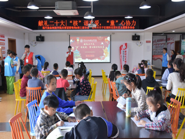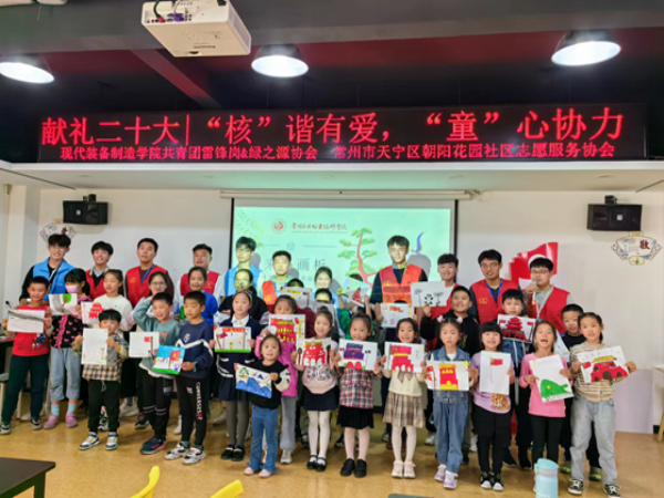 青春逢盛会,奋斗正当时。2022年10月16日,中国共产党第二十次全国代表大会在首都北京召开,作为新时代的青年,要永远跟党走,担时代使命,不负殷殷嘱托。在党的二十大胜利召开之际,常州市天宁区朝阳花园社区志愿服务协会携手现代装备制造学院共青团雷锋岗和绿之源协会在天宁区雕庄街道朝阳花园社区工联会,开展“‘核’谐友爱,‘童’心协力向未来”志愿宣讲活动,献礼党的二十大。激励引导青年职工在志愿服务活动中汲取成长奋进的力量,践行强国有我的责任担当,并引导社区青少年“童”心向党,献礼党的二十大协力向未来。