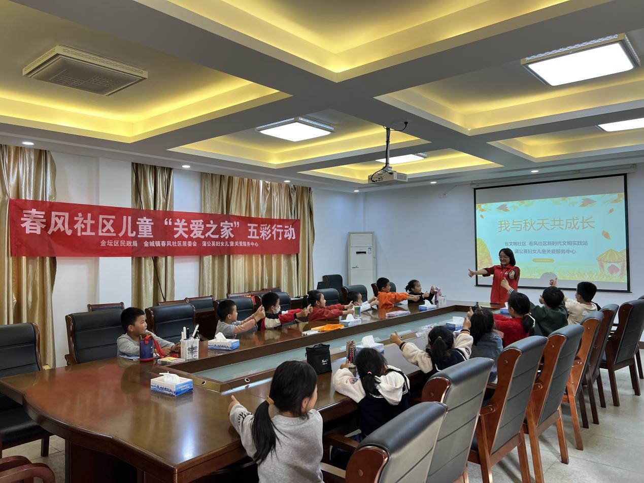 十月是金色的,也是丰收的季节,从夏季到秋季自然界会发生许多变化,草儿变黄了,树叶落了,树上结果子了,天气凉了。这所有的一些都是孩子们感兴趣的,孩子们会问:“为什么草儿会变黄呢?”“为什么树叶会落下来呢?”等许多问题。为了让孩子更好的感受秋天,了解秋天,10月18日下午,常州市金坛区金城镇春风社区联合蒲公英妇女儿童关爱服务中心开展“我与秋天共成长”儿童关爱之家“五彩行动”。