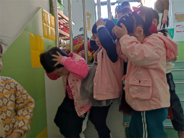上午各班像往常一样进行教学活动时,突然警铃响起,孩子们在老师的组织下,护住头部,弯腰低身,按照逃生路线有序逃生。疏散至安全地带后。教师迅速清点人数,进行报告。整个疏散过程中仅用了3分钟,无发生任何意外,真正的做到了快速、安全、有序。