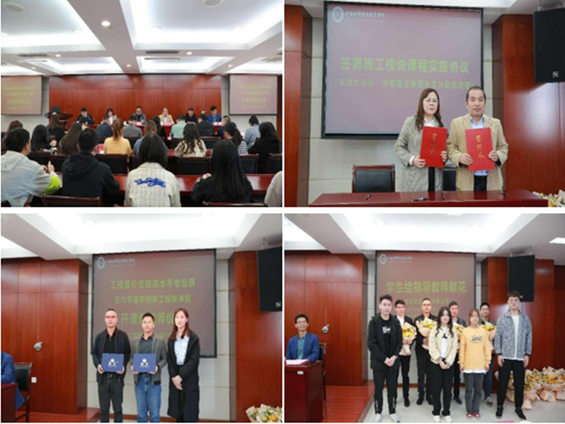 日前,常嘉建设集团与江苏城建学院“双师型”教师企业实践工作站正式授牌成立。10月25日,在江苏城建学院行政楼2楼会议室隆重举行了施工模块课程开课暨拜师仪式,土木工程学院院长杨建华与集团工程副总张文为共同签署了《施工模块课程实施协议》,公司项目经理蒋贵乐、徐豪杰受聘为该课程的企业指导老师。
