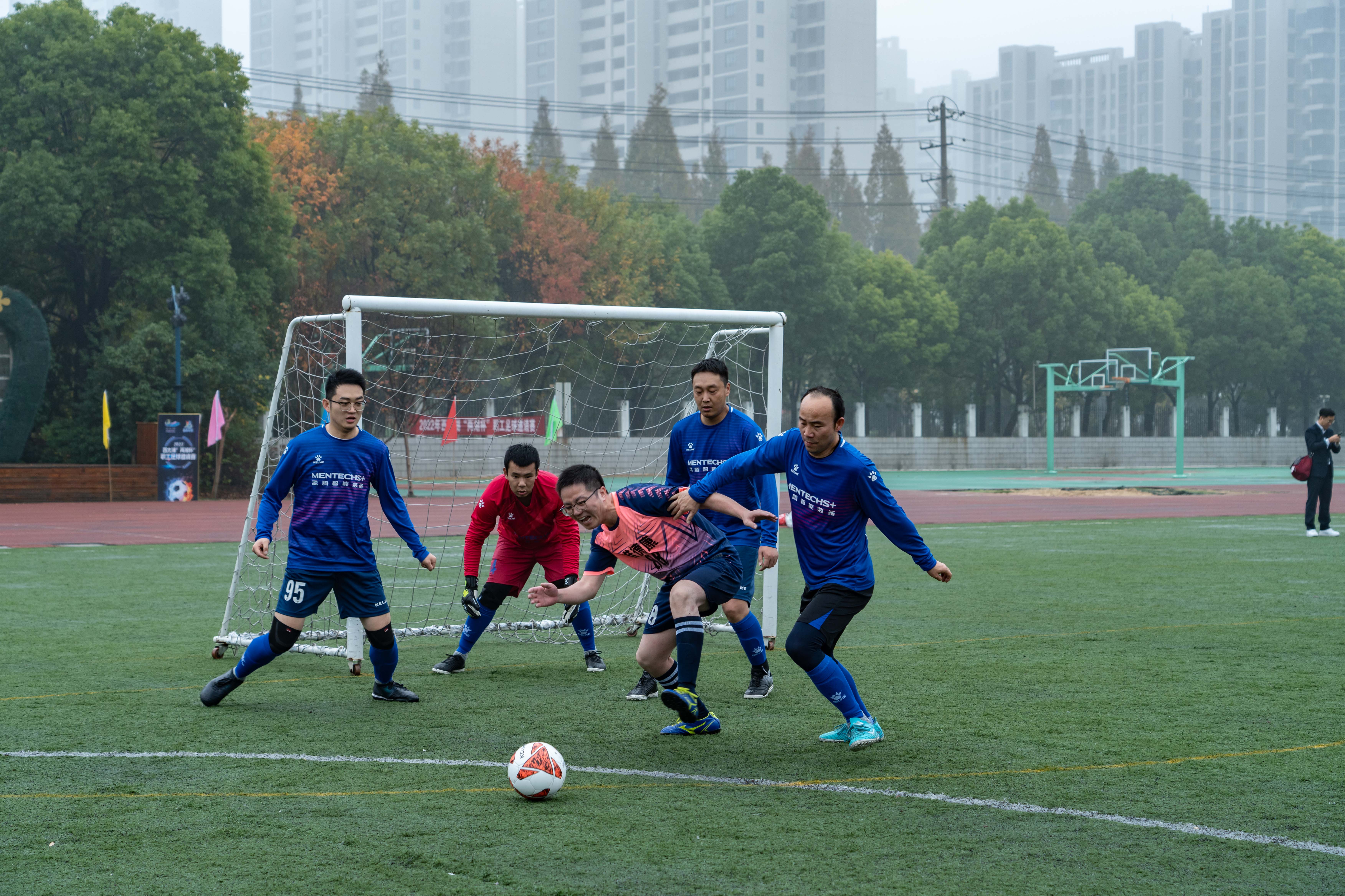 首场比赛,由孟腾智能装备“孟之光”代表队对战唯德康代表队。虽然场地湿滑,但大家秉持竞技精神、胸怀竞技热情,在场上你来我往、互不相让。带球过人、突破射门、精彩扑救,激烈场面让在场观众掌声不断,大家你追我赶,奋力驰骋,大有“球场争锋,舍我其谁”之势。最终,孟腾智能“孟之光”队拿下首场比赛的胜利。