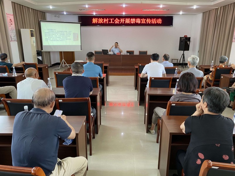 解放村委通过向企业发放禁毒倡议书、设立禁毒宣传专栏、组织禁毒讲座、观看禁毒影视片、街头宣传咨询活动等多种形式宣传;在宣传橱窗开展毒品宣传教育栏,在公共场所张贴禁毒知识宣传和禁毒公益宣传海报,在企业群转发宣传视频拓展宣传内涵,扩大宣传声势,着重提高广企业全体员工对毒品危害的认识,营造全社会远离毒品,拒绝毒品的舆论氛围,让广大群众对禁毒知识耳濡目染,潜移默化地成为禁毒斗争中的志愿者。帮助他们与毒品划清界限,远离毒品,尽快融入到社会大家庭中来。