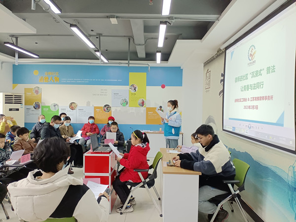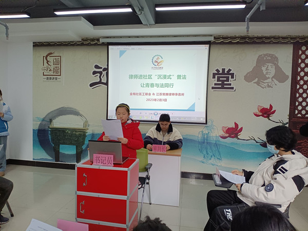 2023年2月3日下午,红梅街道金梅花园社区工联会联合江苏常辉律师事务所在社区三楼会议室共同举办“律师进社区‘沉浸式普法’ 让青春与法同行”活动。本次模拟法庭以一起孩子用过年压岁钱,借大人的账号充值网上游戏引发的经济纠纷案件为庭审内容,由江苏常辉律师事务所高久巍律师和金梅花园社区的青少年共同出演。